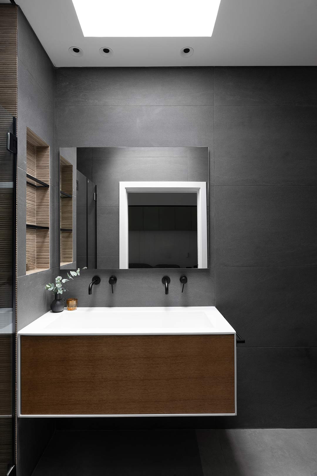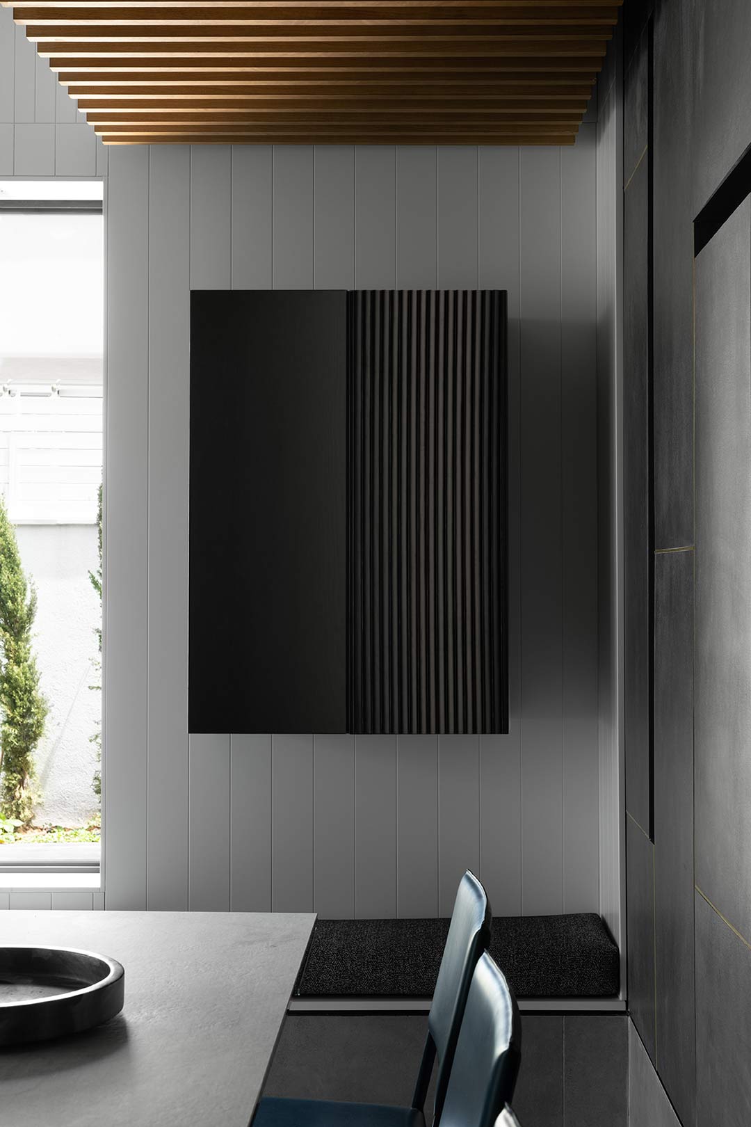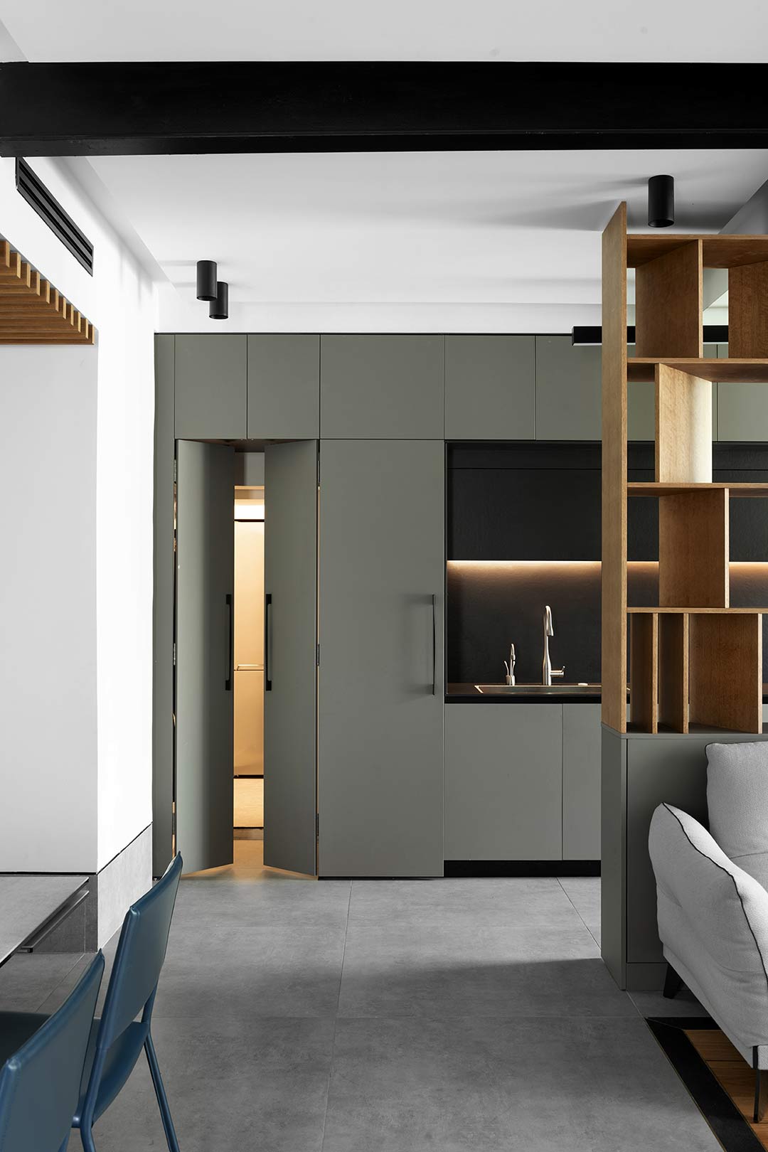 מעבר נסתר משתלב באופן הרמוני בעיצוב המטבח, ומשמר מראה נקי ואחיד. פתרון פונקציונלי שמתמזג עם הקו העיצובי בלי להפר את האיזון הוויזואלי.