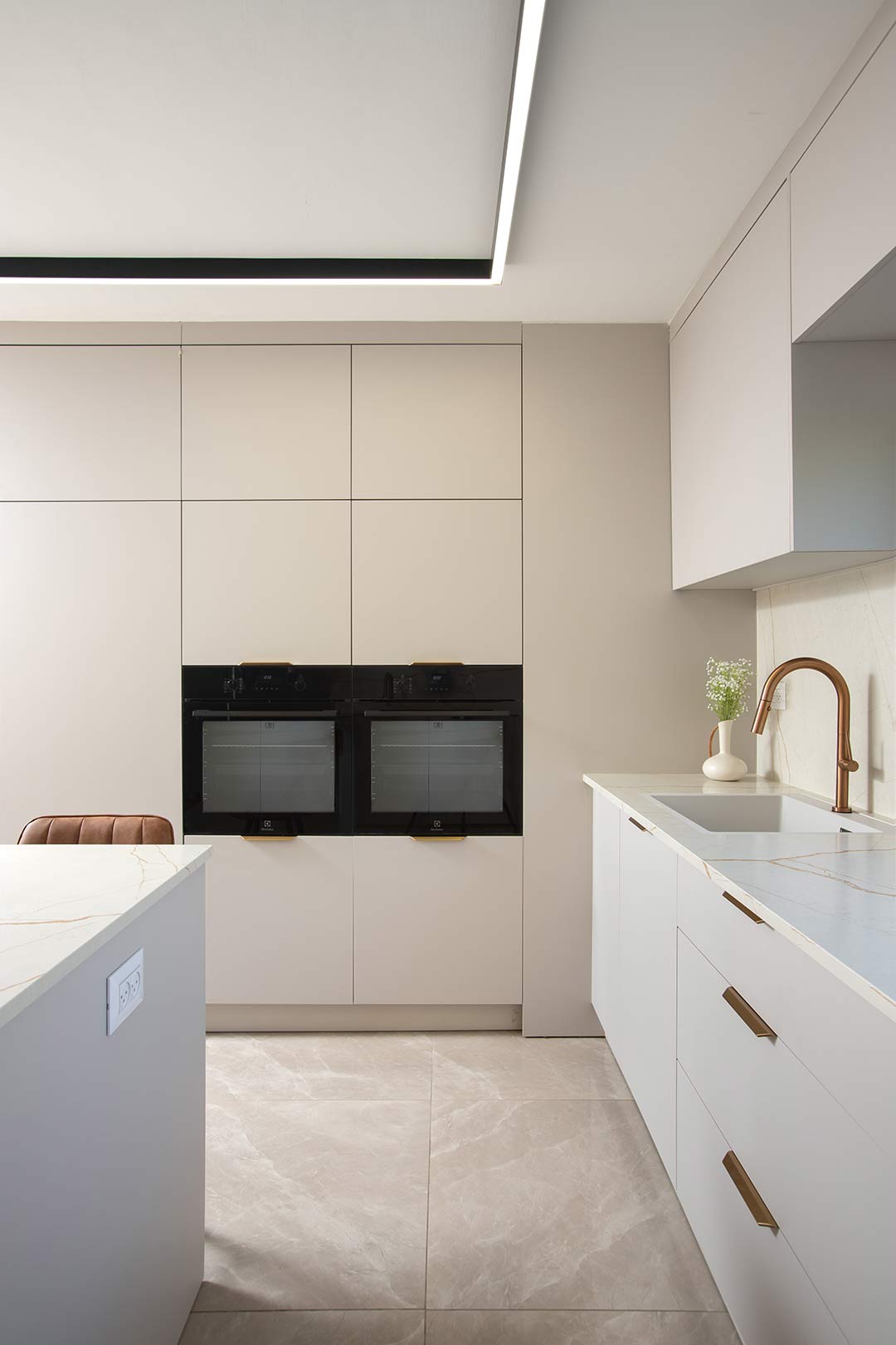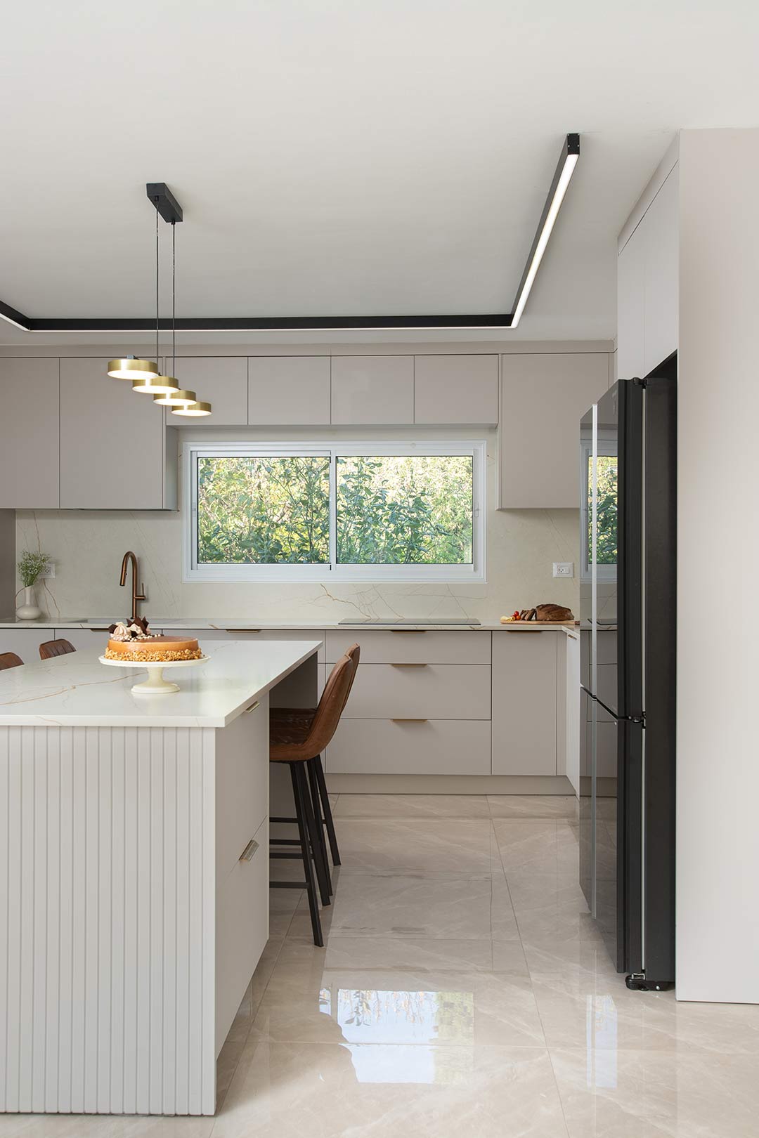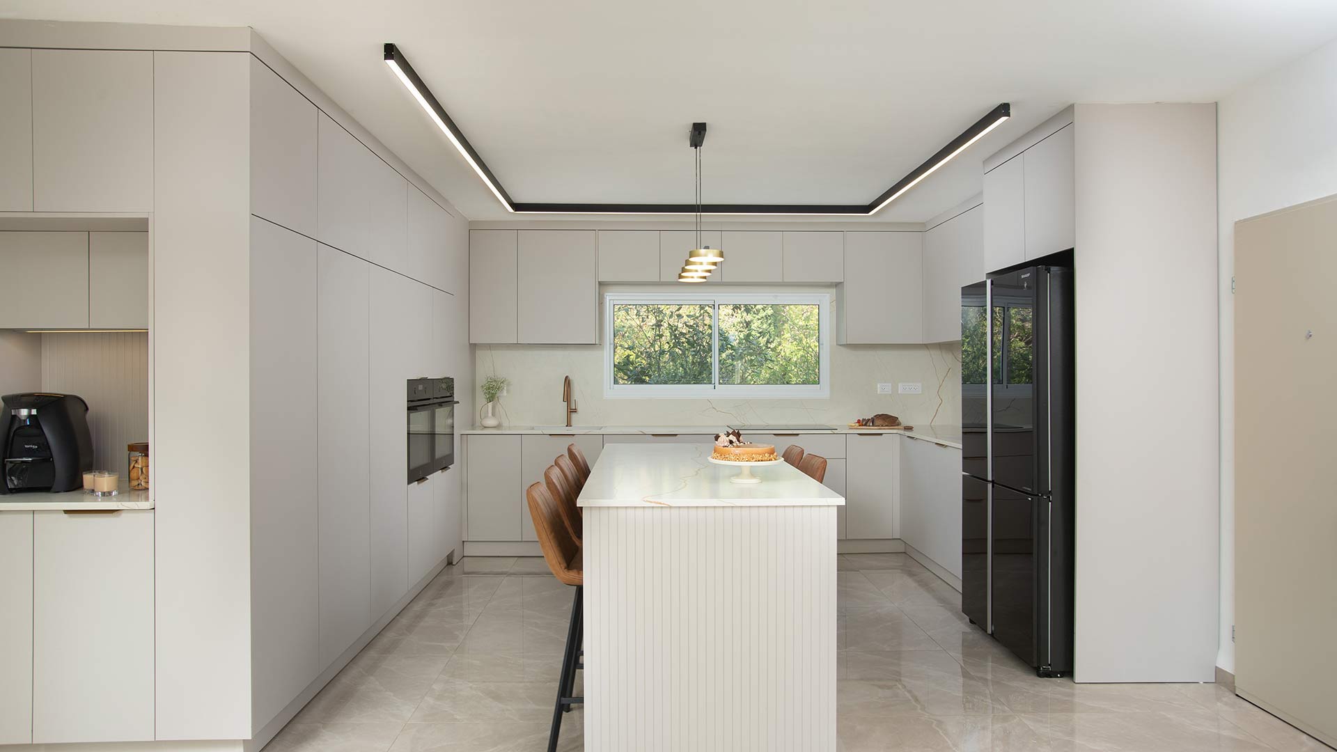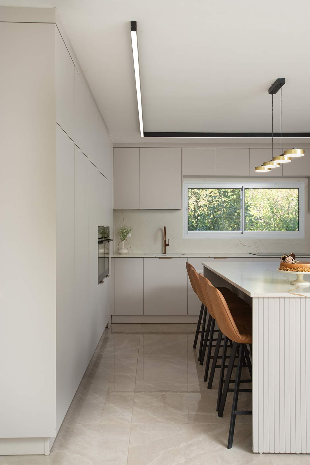 האי המרכזי הרחב מהווה את הלב העיצובי והפונקציונלי של המטבח, ומוסיף לא רק משטח עבודה רחב ונוח, אלא גם אזור ישיבה מזמין למשפחה ולחברים. בעיצוב חכם ומוקפד, הוא מאפשר שילוב מושלם בין עבודה קולינרית לאווירה חברתית חמה, ויוצר נקודת מפגש טבעית שמחממת את חלל הבית ומעודדת שיח וחיבור.
