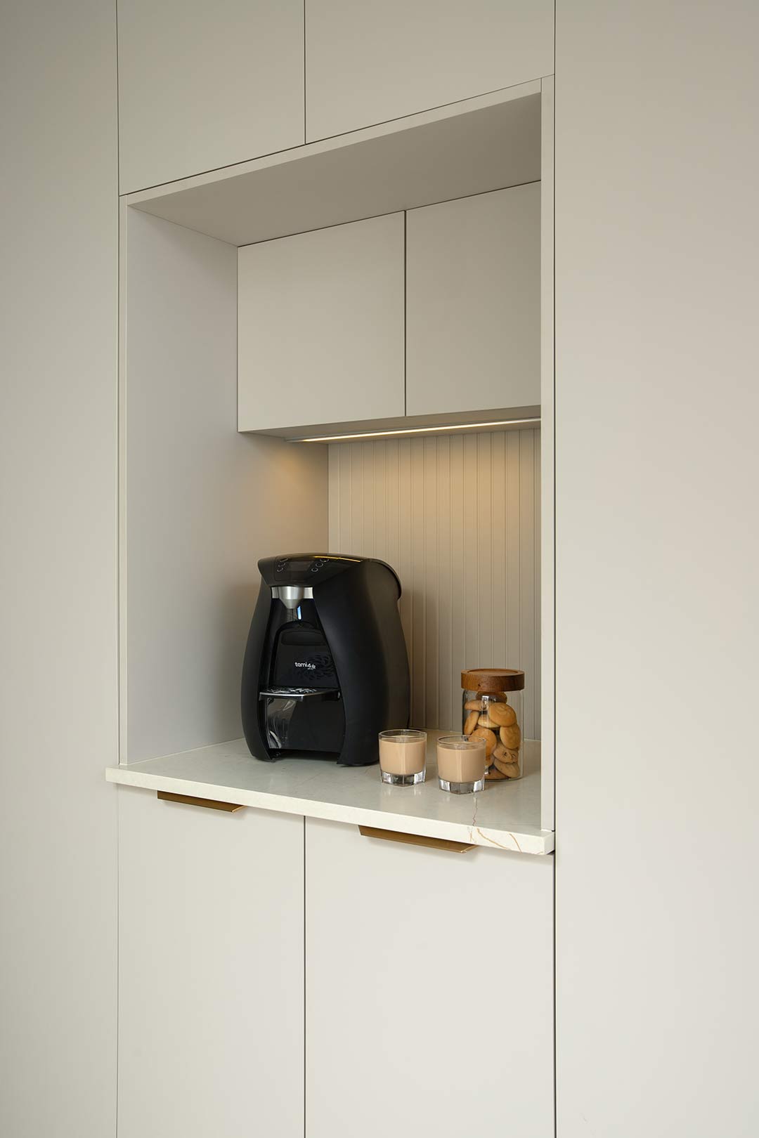 המטבח מתאפיין בחזיתות בגוון חם ומזמין, המדגישות את הקווים הנקיים והאחידות העיצובית. הבחירה בגוונים אלו יוצרת אווירה ביתית ונעימה, שמשלבת בין אלגנטיות לפשטות ויוצרת חלל הרמוני ושלם.